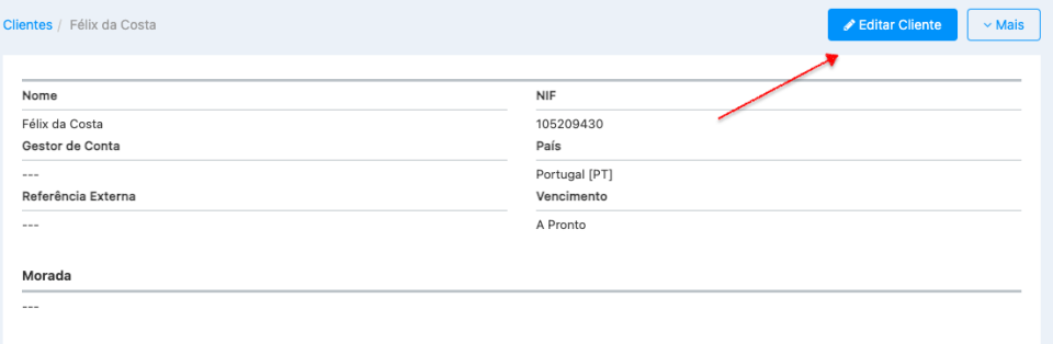 Clique no cliente e, em seguida, em cima do lado direito, clique na opção Editar.