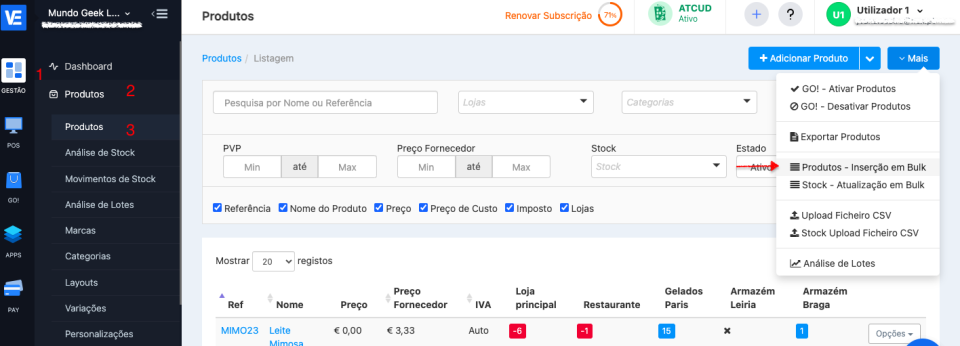 Pode, também, introduzir os produtos em Bulk. Este modo de inserção é mais rápido mas menos detalhado.