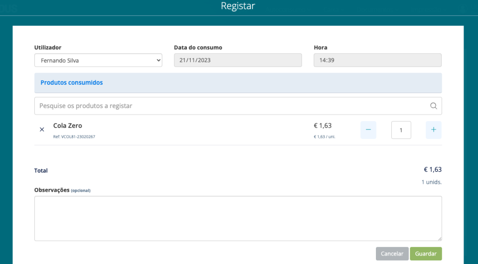 Clicando em Registar, pode adicionar um produto em Autoconsumo. A data e a hora estarão já preenchidas em tempo real, tendo então a hipótese de escolher qual o utilizador e produto que quer registar. Se necessário, pode ainda adicionar uma observação manualmente.