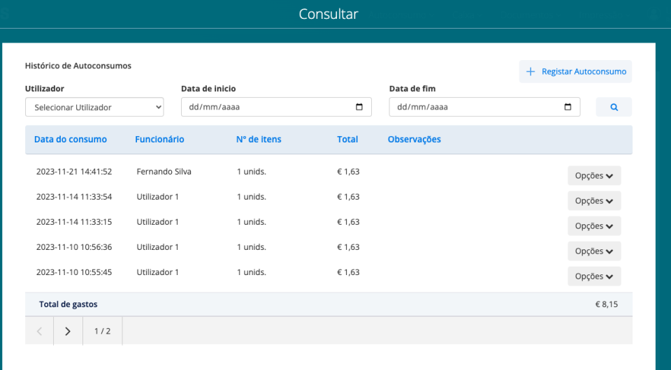 Clicando em Autoconsumo > Consultar, tem acesso à listagem de movimentos referentes a esta funcionalidade.
