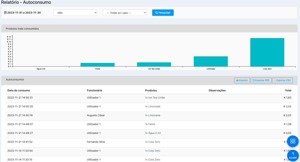 Para gerar um relatório de Autoconsumo, pode aceder no seu Backoffice a Gestão > Relatórios > Restaurante. Clique em Autoconsumo para gerar um relatório que pode ser impresso, exportado para PDF ou CSV.
