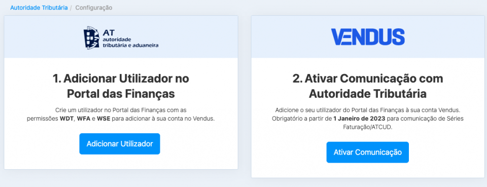 Se já tiver um utilizador configurado para por exemplo comunicar o SAFT, basta entrar no site da AT com o seu utilizador normal (o contribuinte) e adicionar a opção WSE no subutilizador, que corresponde à comunicação de séries. Do lado do Vendus, em Gestão > Autoridade Tributária > Configuração coloque a indicação da nova opção que ativou.