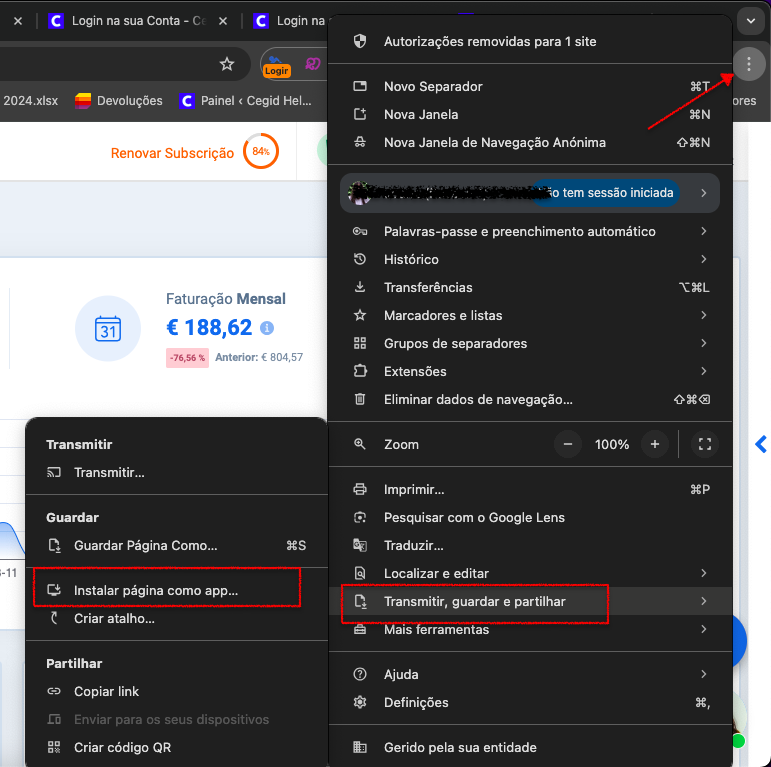 Caso queira criar um atalho directo para a sua conta Vendus no ecrã de trabalho através do google chrome, apenas tem de seguir estes passos:
