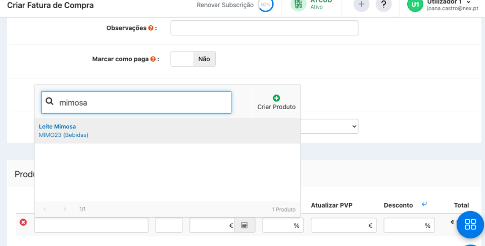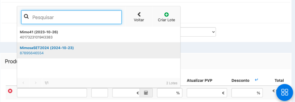 Ao criar uma fatura de compra pode indicar o Lote do produto recebido. Quando adiciona o produto à fatura, deve escolher o lote que pretende dar entrada. Caso este não exista, pode criar diretamente na fatura um Lote novo.