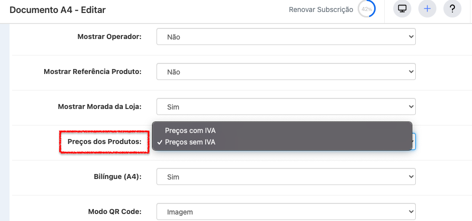 Em Preços dos Produtos seleccione Preços sem IVA.