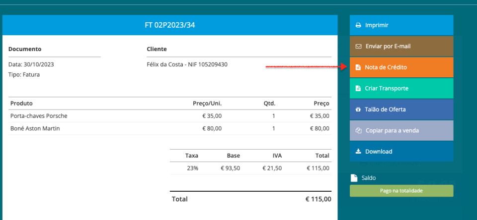 - No campo Ações do Documento (lado direito), clique em Nota de Crédito.