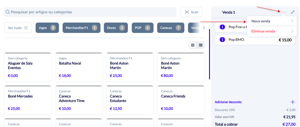 Para adicionar a nova venda, clique nas reticências da venda actual e verá a opção de adição de nova venda.