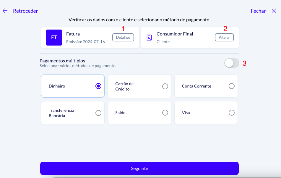 3. Caso pretenda inserir múltiplos pagamentos, active este botão. Pode colocar que uma parte foi paga em dinheiro e outra em cartão por exemplo.