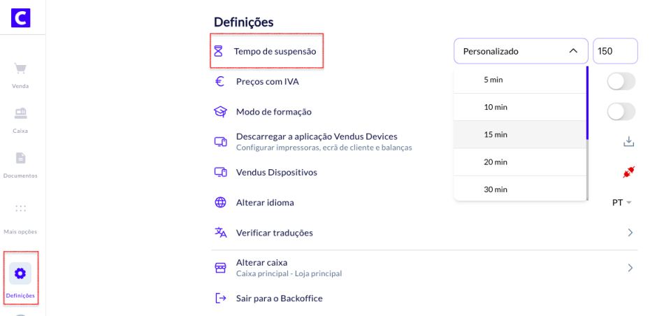 Para aceder a esta configuração, vá a Definições > Tempo de Suspensão e defina o tempo.