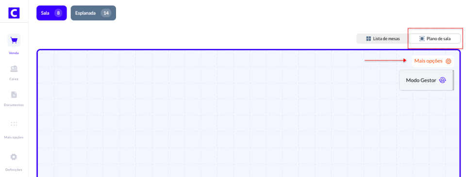 Para aceder à criação do layout, no POS, clique em Plano de Sala e depois em Mais Opções.