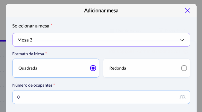 Para adicionar Mesa, clique Mais Opções > Adicionar Mesa e preencha os campos. O número de clientes não é obrigatório.