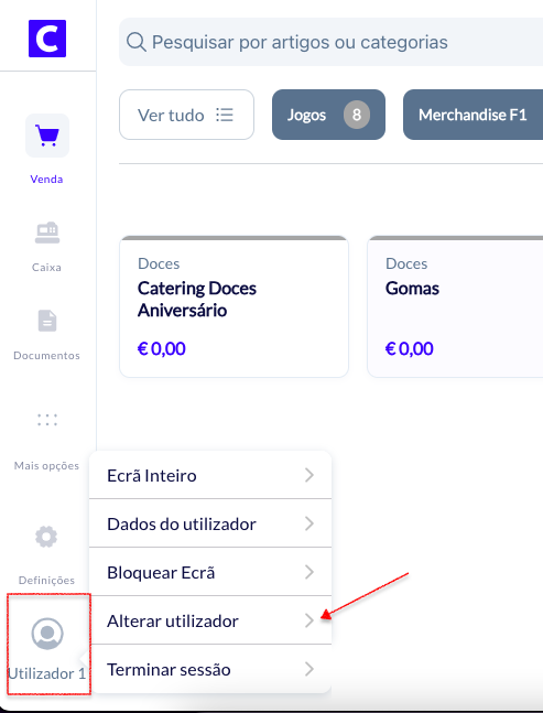 Para mudar de utilizador, basta clicar em baixo do lado direito no utilizador actual e clicar na opção para alterar.