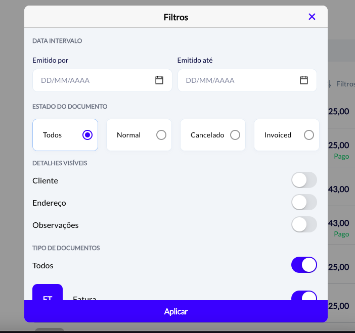 Clicando em Documentos, do lado direito, pode aceder à listagem de documentos emitidos no seu programa. Pode ainda pesquisar pelo nome, NIF ou número de documento.