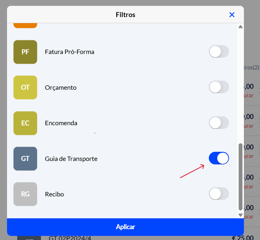 Para pesquisar no POS documentos de transporte que ainda não tenham sido faturados, vá a Documentos, do lado direito, e em Filtros seleccione apenas o tempo de documento Guia de Transporte.