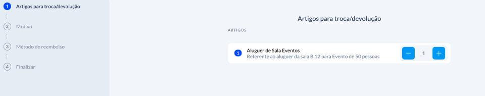 Será pedido para escolher os artigos para devolução/troca, motivo, método de reembolso e finalizar.