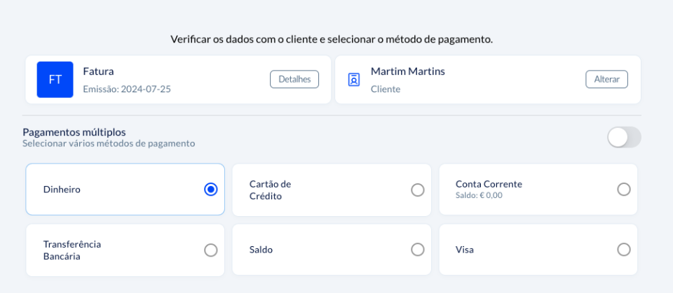 Clique em Cobrar para passar ao ecrã seguinte. Aqui, poderá inserir o cliente, alterar o tipo de documento e escolher o método (ou métodos) de pagamento. Estando tudo preenchido, pode avançar.