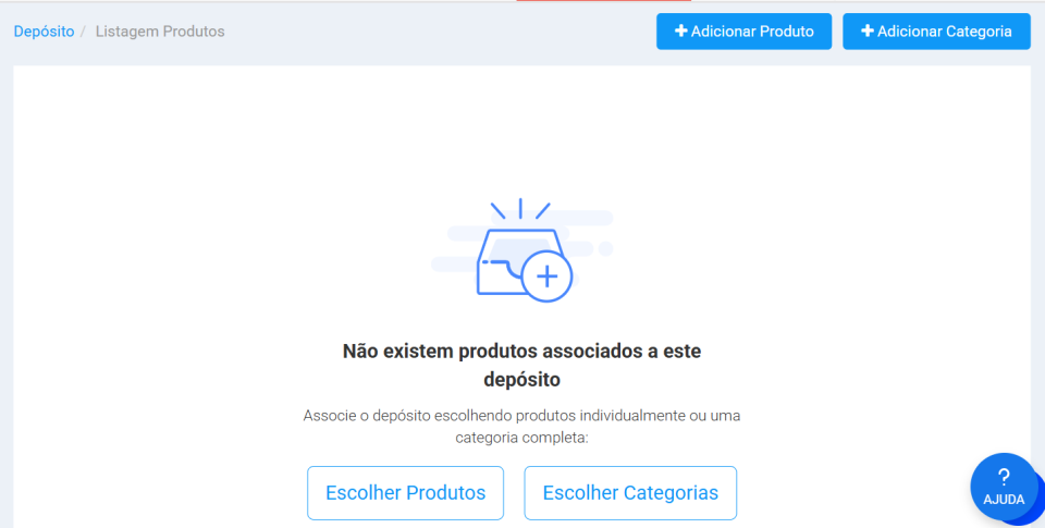 Após criação do depósito, verá logo a página onde pode adicionar produtos ou categorias que estejam sujeitos à cobrança do depósito.