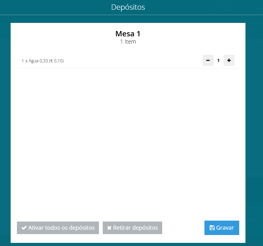 Na venda, é possível ter o controlo do total dos depósitos faturados, podendo acrescentar ou retirar quantidade de depósito - basta para isso clicar no próprio depósito para abrir a sua gestão. Caso não queira cobrar o depósito, também o poderá fazer clicando em Retirar Depósitos. A opção Ativar todos os depósitos faz com que os depósitos fiquem novamente ativos, voltando o valor a ser associado à venda.